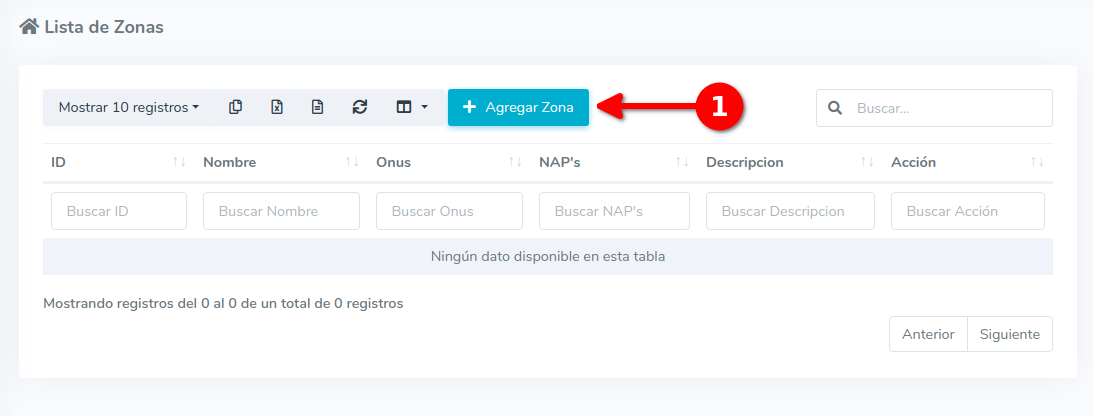 2Una vez en la lista de zonas. Esto nos mostrara una lista con todas las zonas con las que contamos actualmente en AdminOLT. Para agregar una nueva zona debemos seleccionar la opción "Agregar Zona".