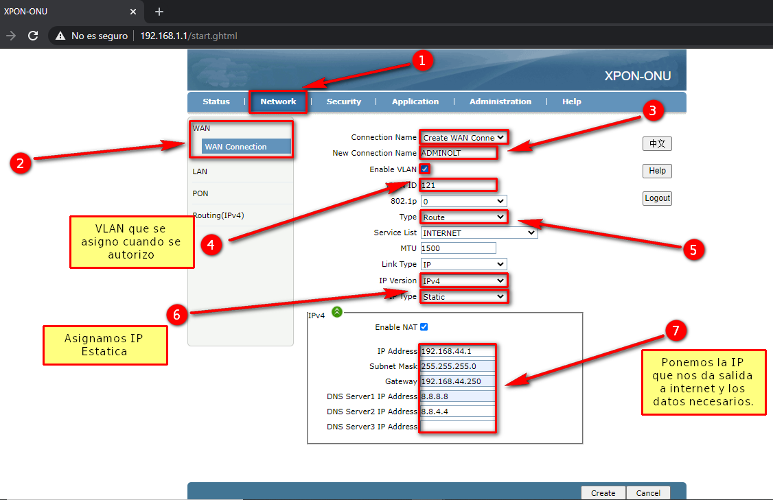 3 Asignar IP Estatica WAN a la ONU.
