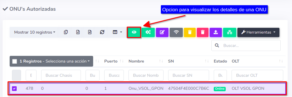 1Para ver los dispositivos que aún no han sido autorizados debemos dirigirnos a la sección ONU > Sin Autorizar y seleccionar alguna ONU disponible.