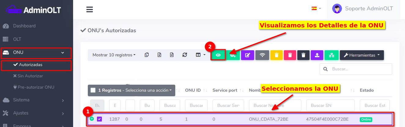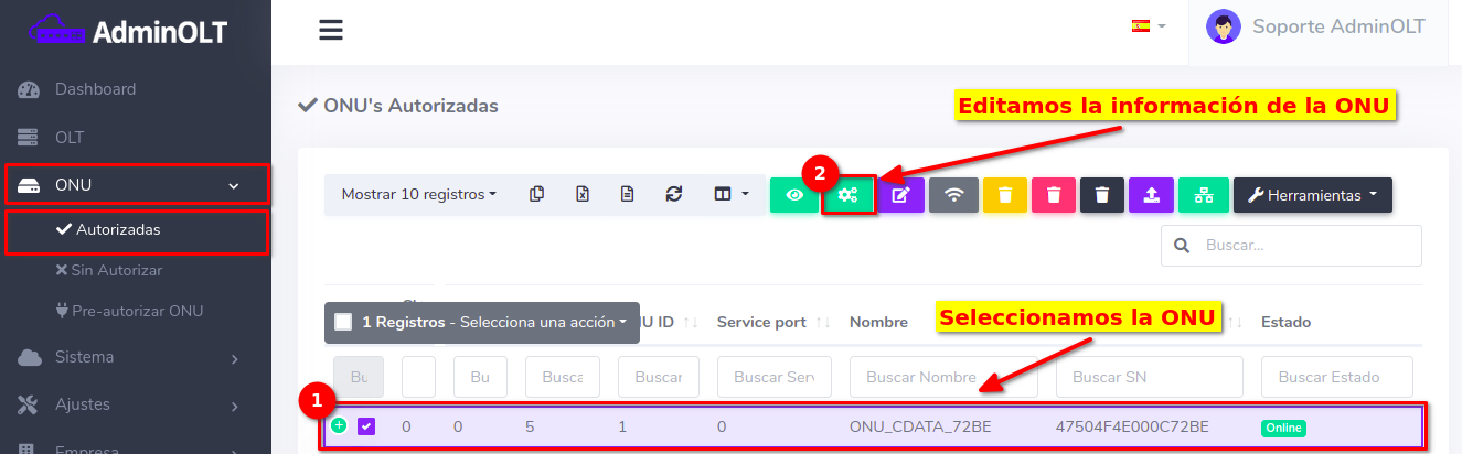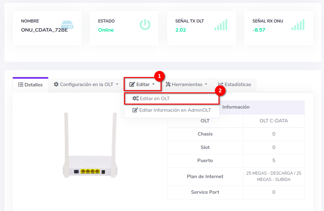 Dar click en el texto Editar en OLT que se encuentra en el botón con la leyenda Editar.