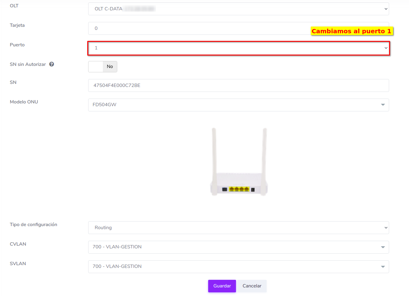 Para editar el Puerto de una ONU en la OLT existen 2 formas de hacerlo: