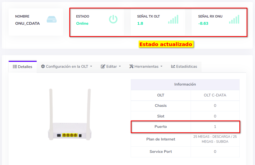 Tome en cuenta que el puerto PON de la OLT debe tener deshabilitados los modos Auto y Adaptive. Si tiene dudas sobre este tema puede consultar el siguiente manual; Configurar Puerto PON