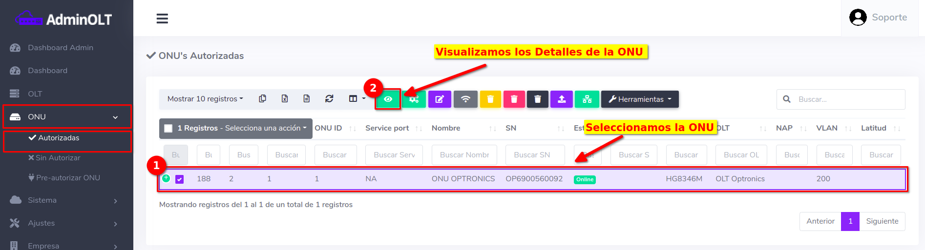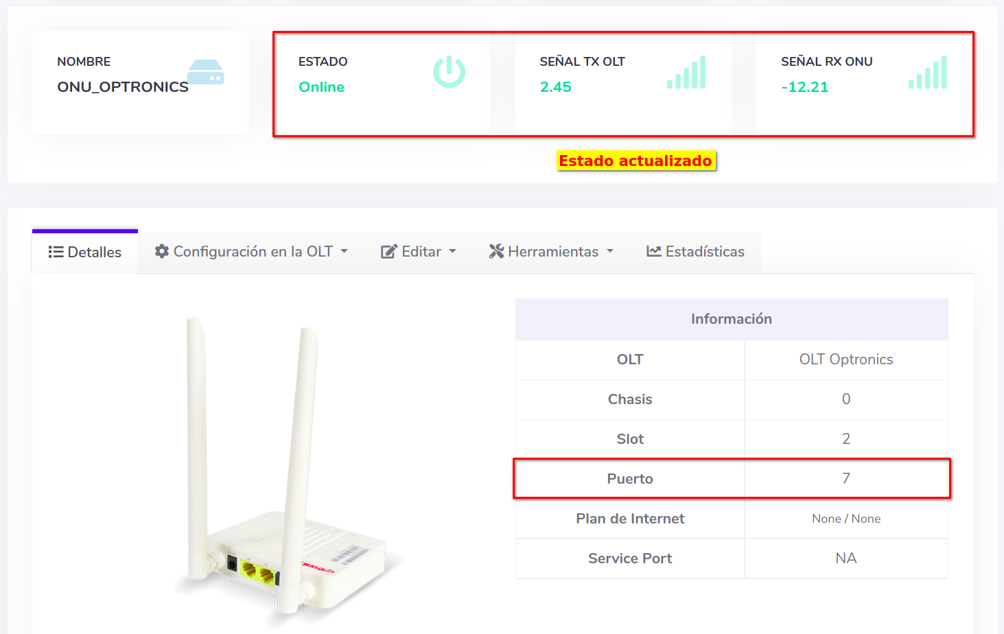 En este ejemplo la ONU se encuentra en en el Puerto 1; lo pasaremos al Puerto 7. Antes de editar verifique que la ONU cuente con servicio