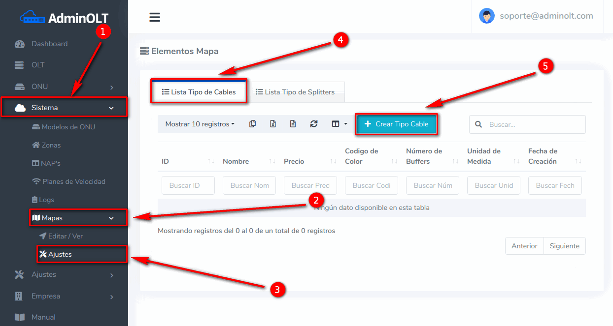 1 Ir a la sección Sistema > Mapas > Ajustes > Lista Tipo de Cables, y damos en Crear Tipo Cable