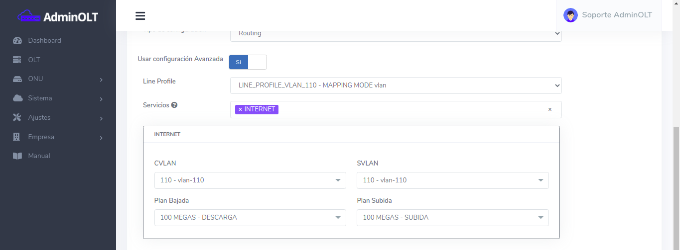 - AdminOLT crea un perfil de linea (Line Profile) en bace a los datos y servicios seleccionados.