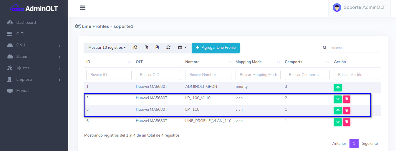 El Line Profile creado automáticamente podrá ser encontrado en la lista de Line Profiles pertenecientes a la OLT.