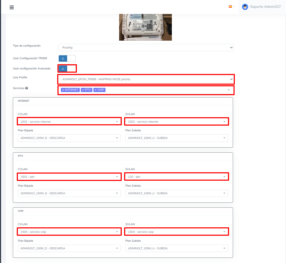 - Servicios: relacionado al Line Profile seleccionado, si se selecciona "Crear perfil generico" podrá escoger entre los diferentes tipos de servicios disponibles (INTERNET, IPTV, VOIP, NMS)