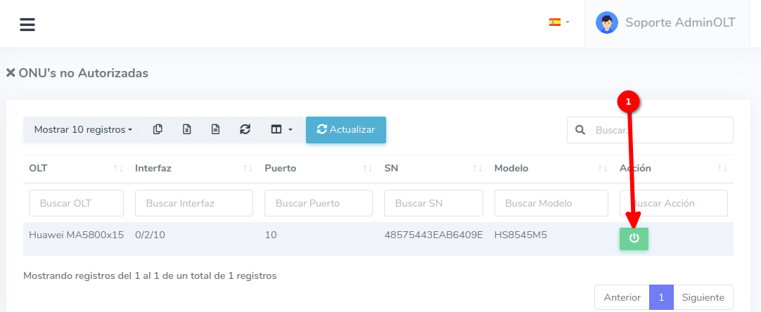 3Despues de guardar los datos de la ONU, se nos redirigira a la vista de ONU's autorizadas donde podremos ver las ONU's que hemos autorizado.