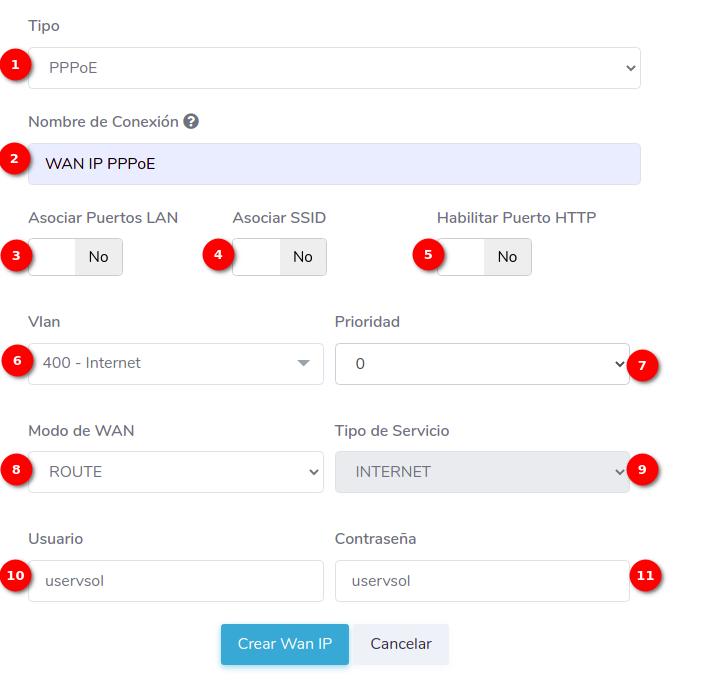 - 1.-Tipo: En AdminOLT se pueden crear configuraciones WAN IP de tipo STATIC, DHCP, PPPoE. En este ejemplo crearemos una WAN IP PPPoE.