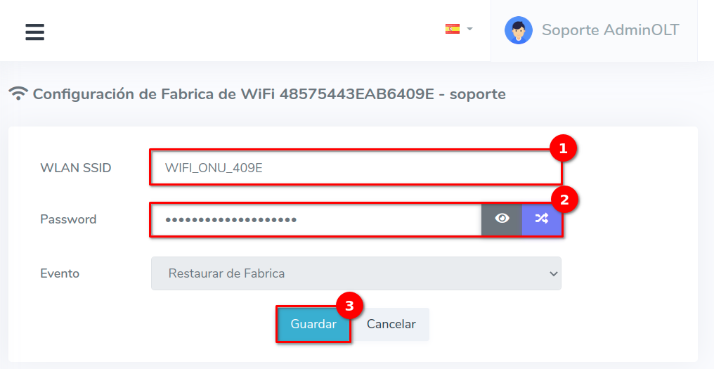 Es importante mencionar que esta información solo será guardada en AdminOLT y no se creará directamente en la ONU, para esto debemos de Aplicar Configuraciones de Fabrica TR069