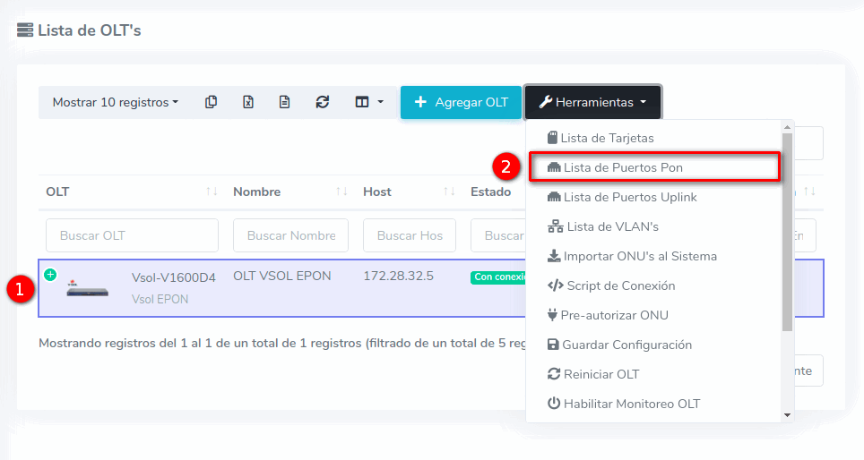 1 Ir a Lista de Puertos PON de nuestra OLT