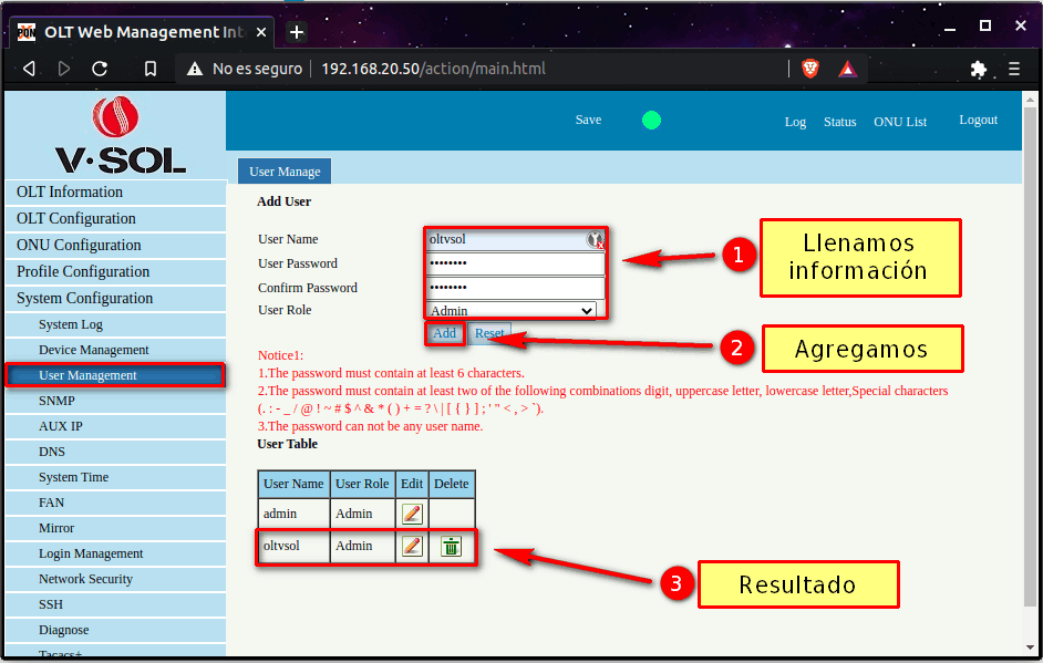 Crear usuario administrador Vsol GPON