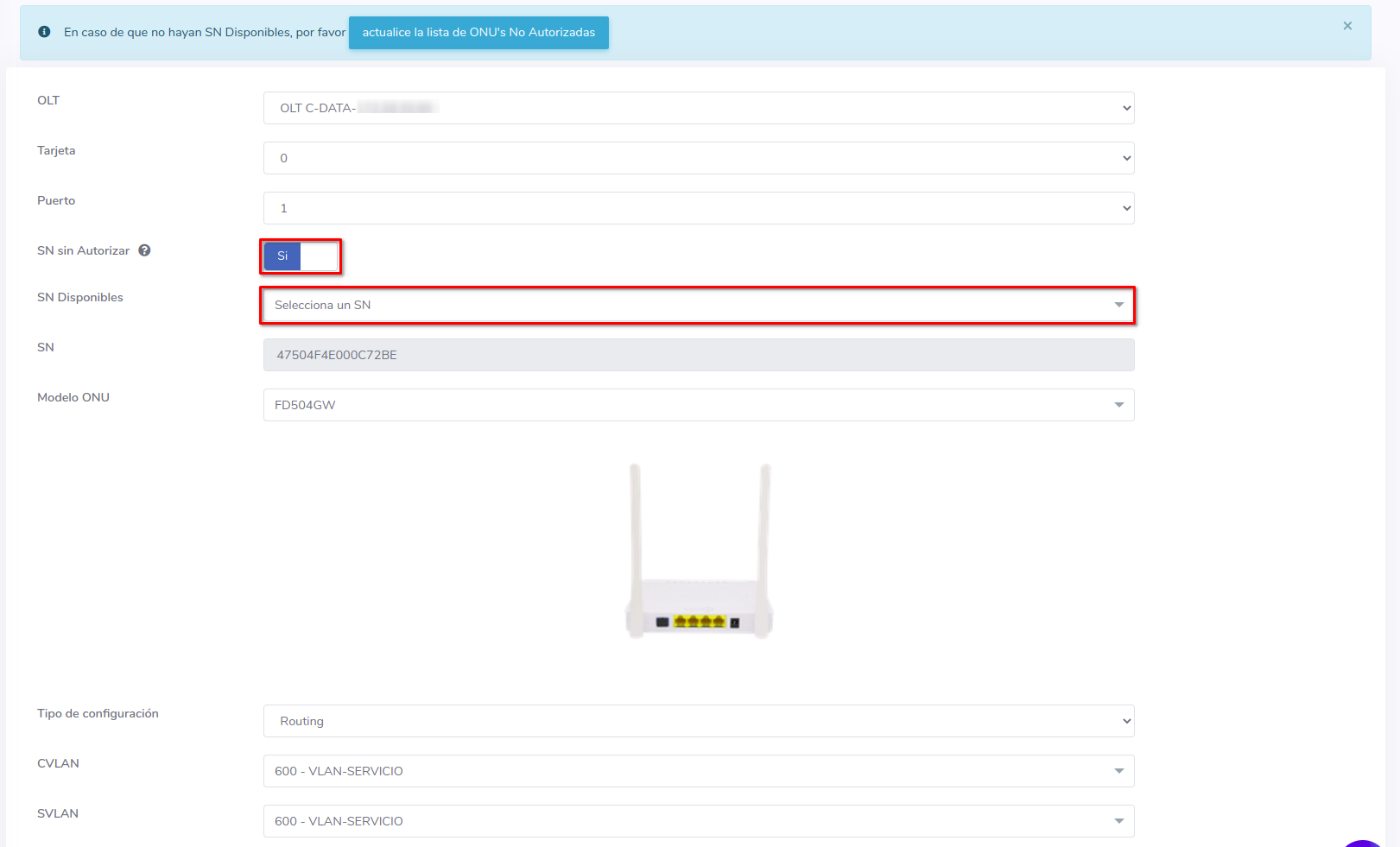 2 Activar la opción SN sin autorizar del formulario y seleccionar algún SN disponible.