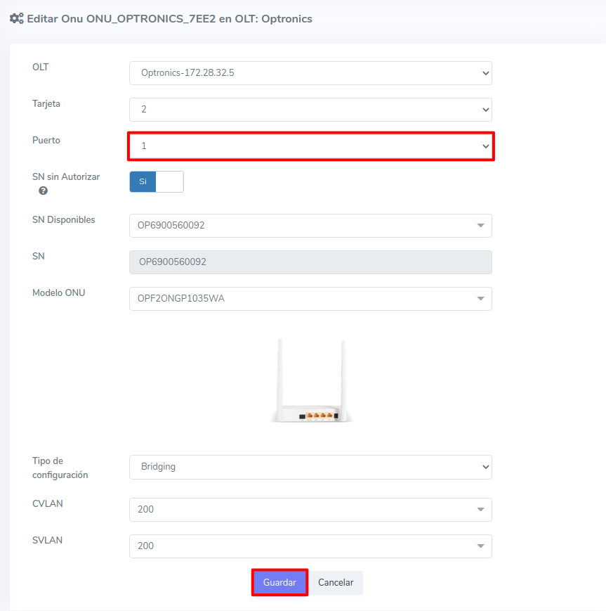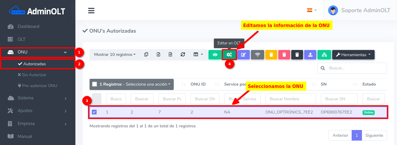 En AdminOLT podemos editar información de una ONU Autorizada en la OLT, supongamos que alguna de las ONUs que tenemos autorizadas en el sistema se estropea. Tomaremos como ejemplo esta situación para explicar el propósito de esta función. Así que en ese caso en AdminOLT al editar ONU por SN podemos tomar información de alguna ONU no Autorizada y usarla, sin perder la configuración inicial que teníamos.