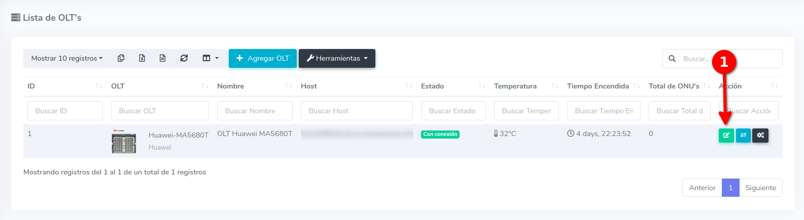 1 Para poder establecer la conexión de manera exitosa es necesario que generemos un script, para poder generarlo, nos dirigimos a nuestra OLT y seleccionamos la opción de editar.