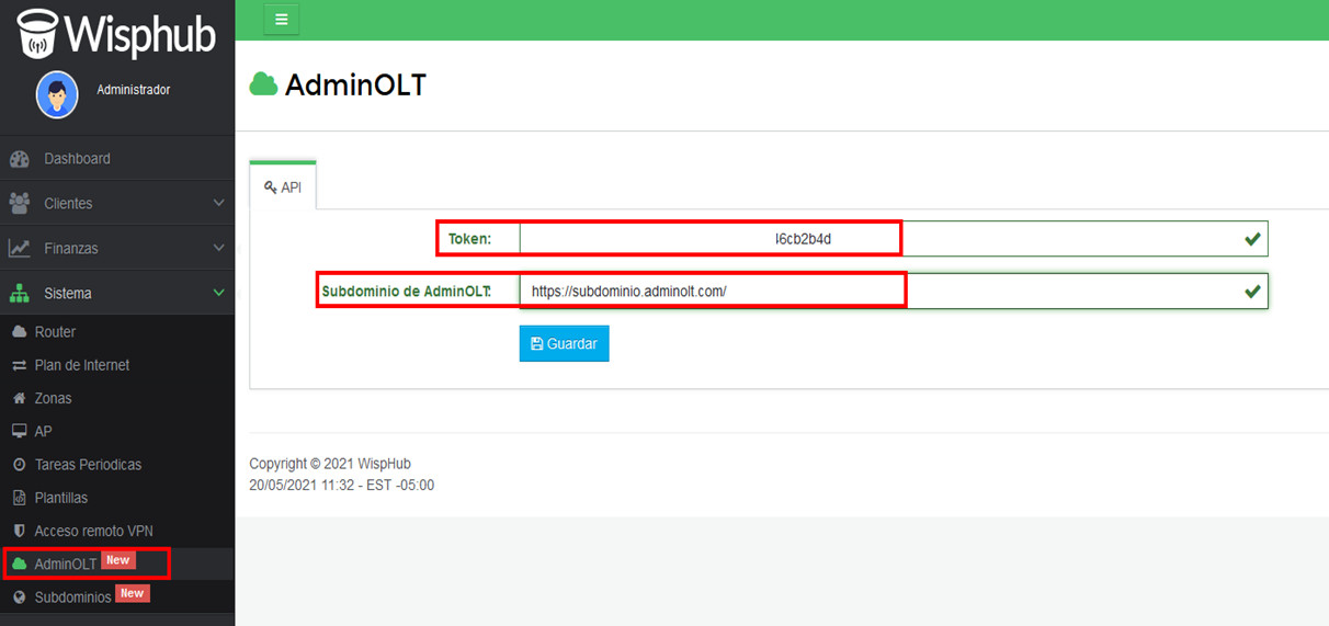 2 Ahora ingrese a https://wisphub.net/adminolt/configurar-api/ e ingrese los datos recolectados en el paso anterior Token y Subdominio adminOLT